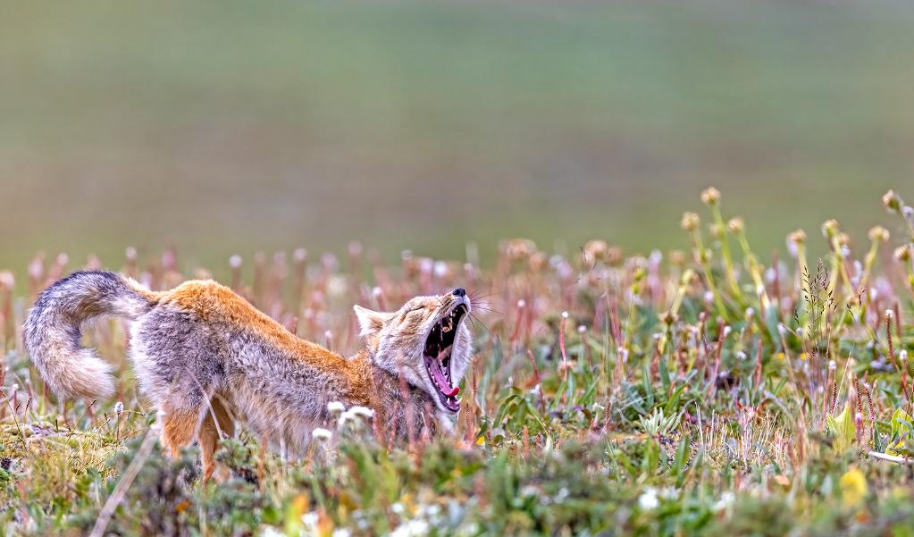這是在昂賽大峽谷內(nèi)拍攝的藏狐(8月6日攝)。(新華社發(fā) 張戈攝)