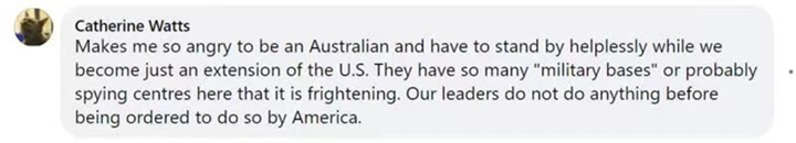 澳大利亞網(wǎng)友凱瑟琳·沃茨說,無助地看著美國的所作所為實(shí)在令人憤慨,而美國在澳大利亞設(shè)立很多軍事基地或情報(bào)機(jī)構(gòu),這一點(diǎn)令人恐懼。