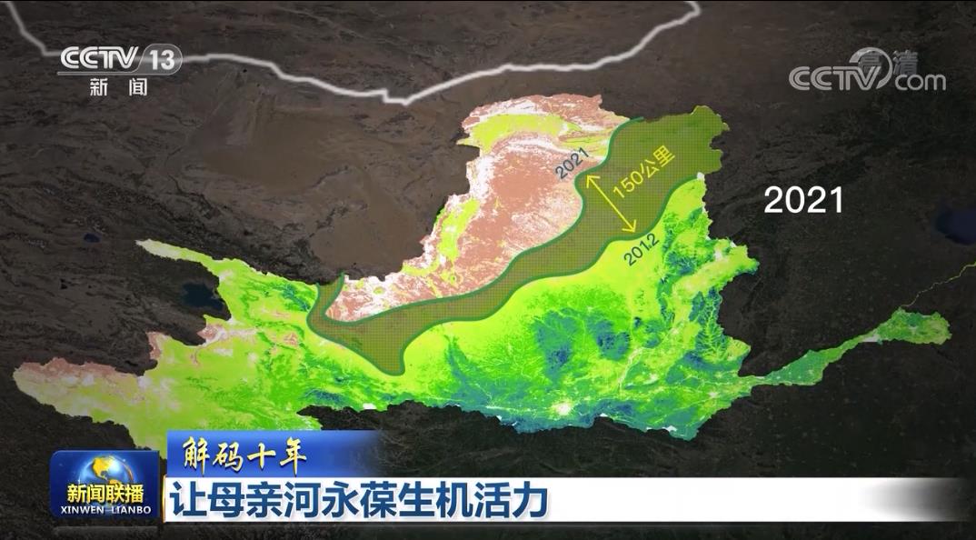 這是衛(wèi)星視角拍攝到的黃河,研究人員連續(xù)數(shù)年監(jiān)測,結(jié)合大數(shù)據(jù)還原了黃河沿岸的生態(tài)狀況??梢郧逦乜吹?,十年間綠進(jìn)沙退,這條黃河生態(tài)綠線最寬處向前推進(jìn)了約150公里。