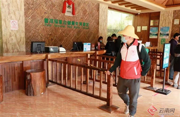 近期,普洱國家公園每日接待2000人左右,景區(qū)游客接待上限為每天1.5萬人,接待量達(dá)到80%時景區(qū)采取及時預(yù)警舉措?!笆燮贝髲d、入園口、電瓶車乘坐點(diǎn)等均有疫情防控的提示牌。除了做好游客健康碼、行程卡檢查和體溫測量工作以外,享受政策性免票的游客在入園登記表上填寫入園日期、姓名、電話等個人信息后才可入園?!逼斩龂夜珗@市場營銷部工作人員劉倩介紹,景區(qū)所有工作人員一周進(jìn)行兩次核酸檢測,游客常聚集的地方安排專人值守,有序疏導(dǎo)。
