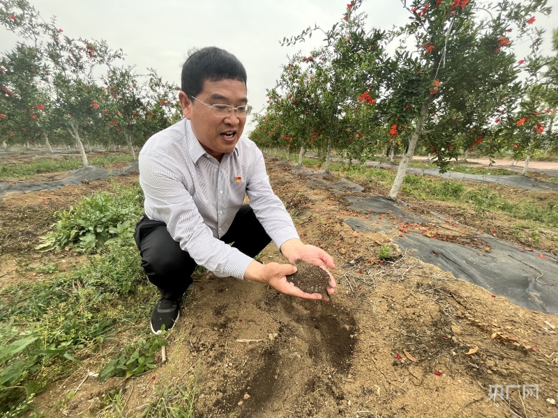 張家祥介紹石榴樹下的生物有機肥(央廣網(wǎng)發(fā) 張惟一 攝)