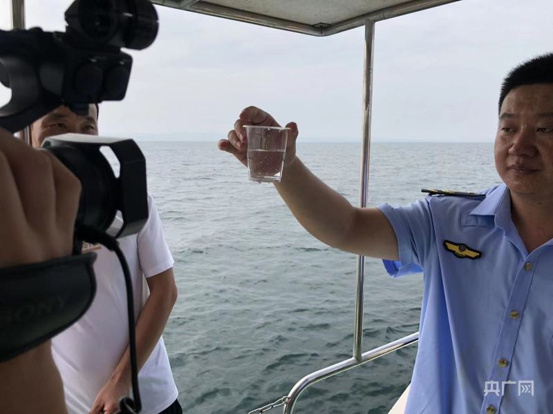 淅川縣丹江庫區(qū)綜合執(zhí)法人員向記者展示丹江水質(zhì)(央廣網(wǎng)發(fā) 張惟一 攝)