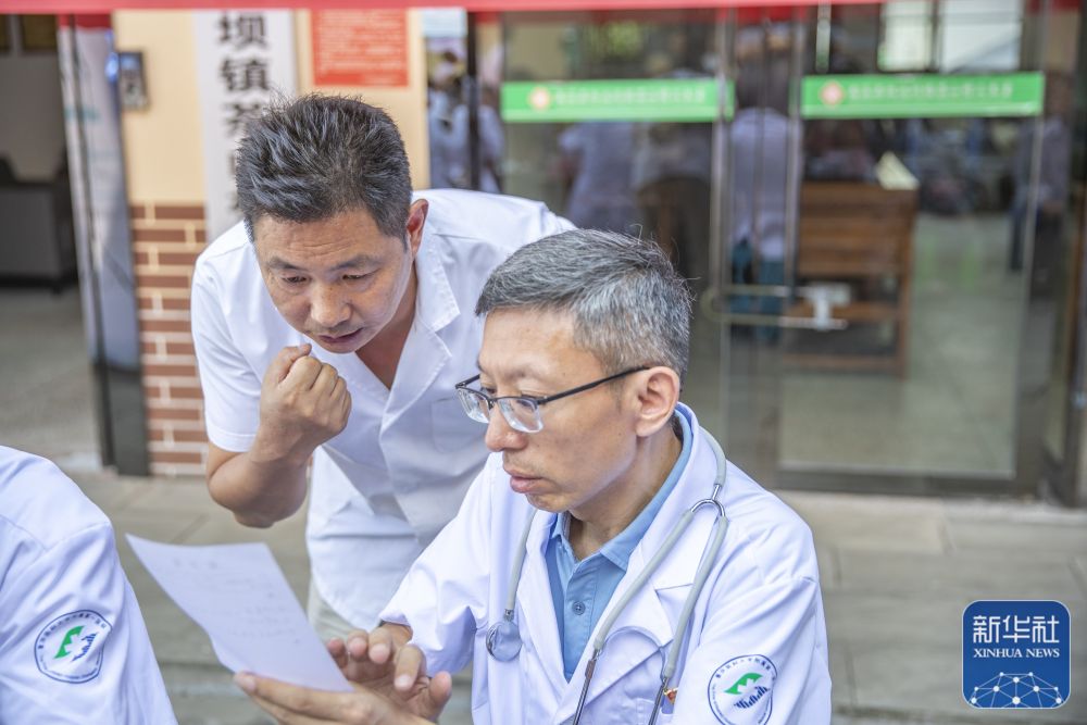 8月11日,在重慶市巫溪縣田壩鎮(zhèn)衛(wèi)生院,在田壩鎮(zhèn)擔(dān)任駐村第一書記的蔣在強(qiáng)(右二)、代濤(右三)、廖正步(右四)和衛(wèi)生院醫(yī)生一起探討優(yōu)化治療方案。新華社記者 黃偉 攝