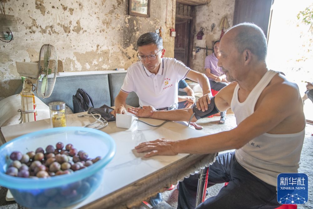 8月11日,在重慶市巫溪縣田壩鎮(zhèn)田壩村,駐村第一書記蔣在強(qiáng)(左)在入戶走訪時為村民做健康監(jiān)測。新華社記者 黃偉 攝