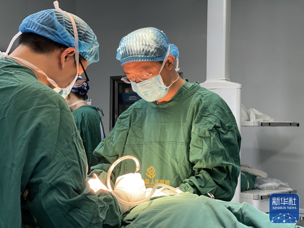 8月10日,在重慶市巫溪縣人民醫(yī)院,田壩鎮(zhèn)雙箭村駐村第一書記廖正步(右)與當(dāng)?shù)蒯t(yī)生一起進(jìn)行手術(shù)。新華社發(fā)(陳玉瓊 攝)