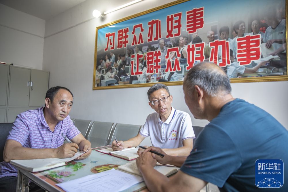 8月11日,在重慶市巫溪縣田壩鎮(zhèn)田壩村,駐村第一書記蔣在強(qiáng)(中)和村工作人員一起討論需要解決的民生問題。新華社記者 黃偉 攝
