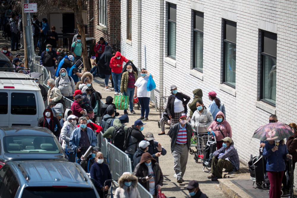 2020年5月14日,人們在美國紐約一個免費食品發(fā)放點排隊等待。(新華社發(fā),郭克攝)
