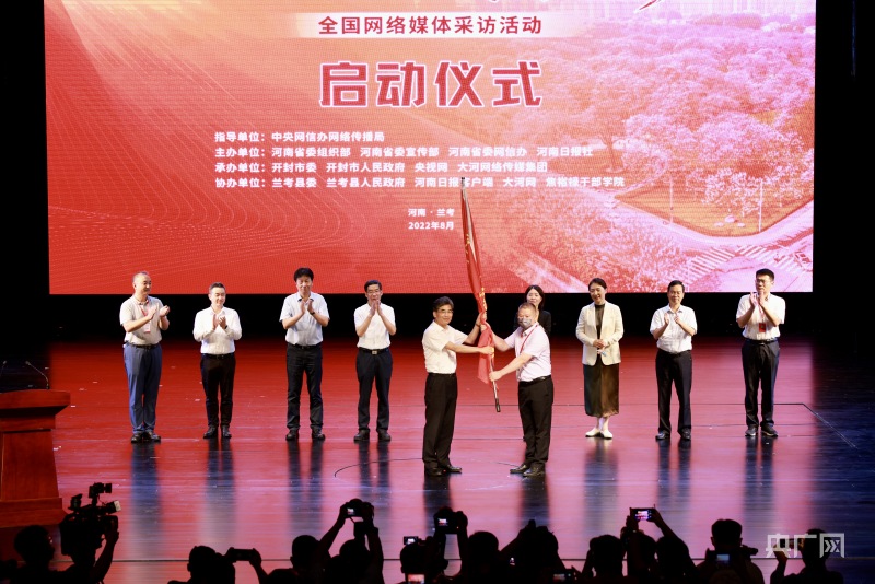 河南省委常委、宣傳部部長王戰(zhàn)營為采訪團(tuán)授旗(央廣網(wǎng)記者 王勇生 攝)