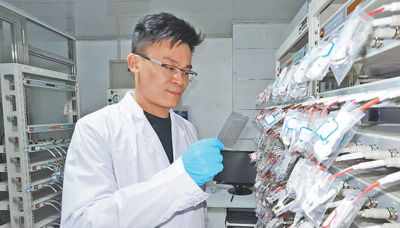 電池實(shí)驗(yàn)室里,王家鈞正在進(jìn)行電池測試研究。