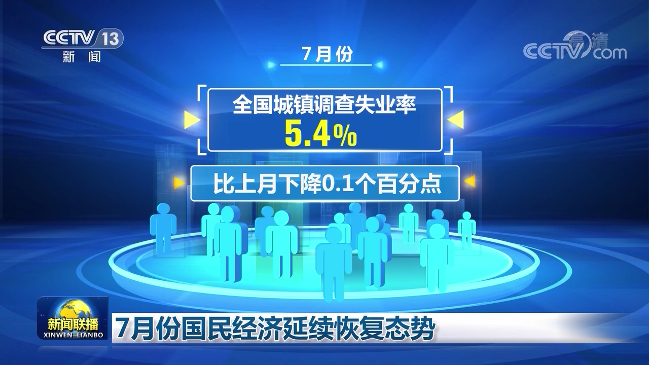 7月,我國就業(yè)形勢總體穩(wěn)定,全國城鎮(zhèn)調查失業(yè)率為5.4%,比上月下降0.1個百分點。