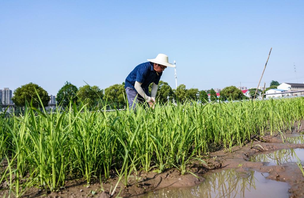 周雷在田間觀察水稻生長情況。