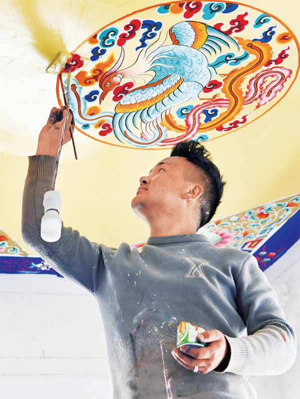 3月28日是西藏百萬農(nóng)奴解放紀念日。在西藏自治區(qū)日喀則市南木林縣卡孜鄉(xiāng)湘河水庫移民新村,129戶、685人慶祝喜遷新居。位于南木林縣境內(nèi)的湘河水利樞紐及配套灌區(qū)工程是國務(wù)院確定的172項重大水利工程之一,也是改善環(huán)境、發(fā)展生產(chǎn)、提高群眾生活水平的民生工程。圖為2022年3月27日,來自日喀則的民間藝人在湘河水庫移民新村一處民居繪制屋頂?!⌒氯A社記者 張汝鋒/攝