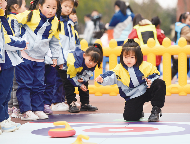 讓老百姓過上好日子,持續(xù)保障改善民生。圖為2022年2月16日,安徽省合肥市泰山路幼兒園的小朋友在開學(xué)典禮上體驗“旱地冰壺”游戲?!⌒氯A社記者 周牧/攝