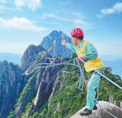 李培生在黃山風景區(qū)蓮花峰上放繩。人民日報 記者 李俊杰攝