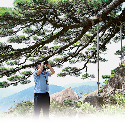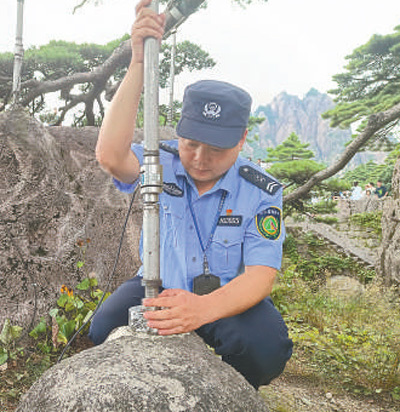 每天早上7點,胡曉春便開始了巡護觀測工作。監(jiān)測松樹枝丫、松針和樹皮的細微變化,檢查支撐架、拉索、防雷設施情況……“白天每隔兩小時進行一次例行檢查,如遇雷暴等天氣,每半個小時就要巡查一次。夜間則啟動紅外線防侵入報警系統(tǒng),隨時隨地查看迎客松情況?!焙鷷源赫f。
