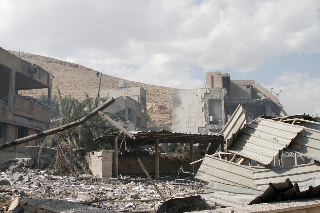 這是2018年4月14日在敘利亞大馬士革東北部拜爾宰地區(qū)拍攝的遭襲的科學(xué)研究中心。當(dāng)天凌晨,敘利亞境內(nèi)政府和軍方多處目標(biāo)突遭美國、英國和法國三國聯(lián)合空襲。(新華社發(fā),梅馬里 攝)