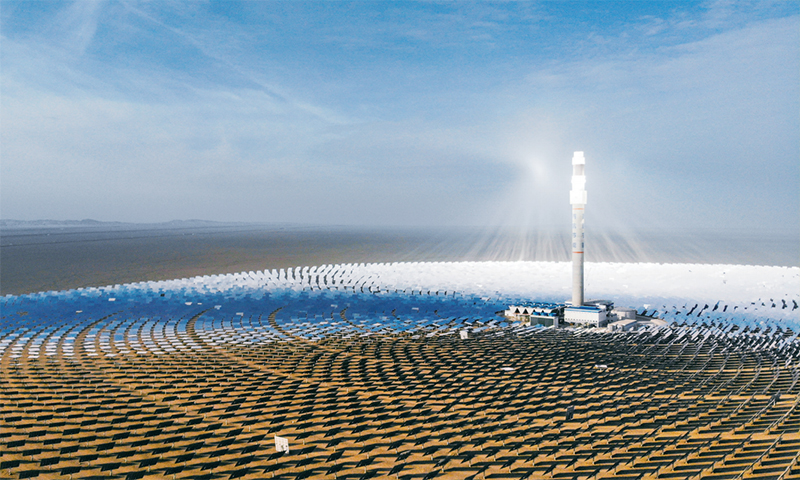 在甘肅省敦煌市向西約20公里處,被稱為“超級鏡子發(fā)電站”的敦煌100兆瓦熔鹽塔式光熱電站在戈壁灘上閃耀。這是我國目前建成規(guī)模最大、吸熱塔最高、可24小時連續(xù)發(fā)電的100兆瓦級熔鹽塔式光熱電站?!⌒氯A社記者 馬希平/攝