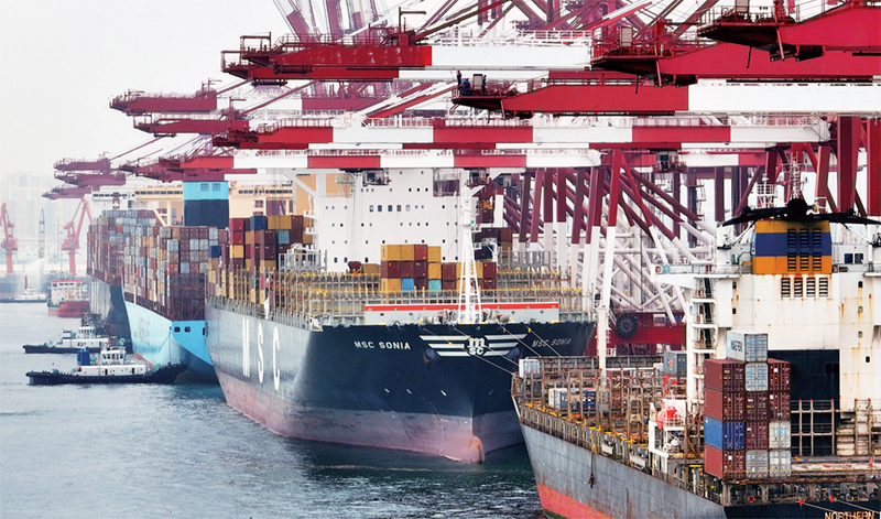 2022年前7個月,我國外貿進出口總值23.6萬億元,同比增長10.4%。圖為2022年7月29日拍攝的山東港口青島港前灣集裝箱碼頭(無人機照片)?!⌒氯A社記者 李紫恒/攝