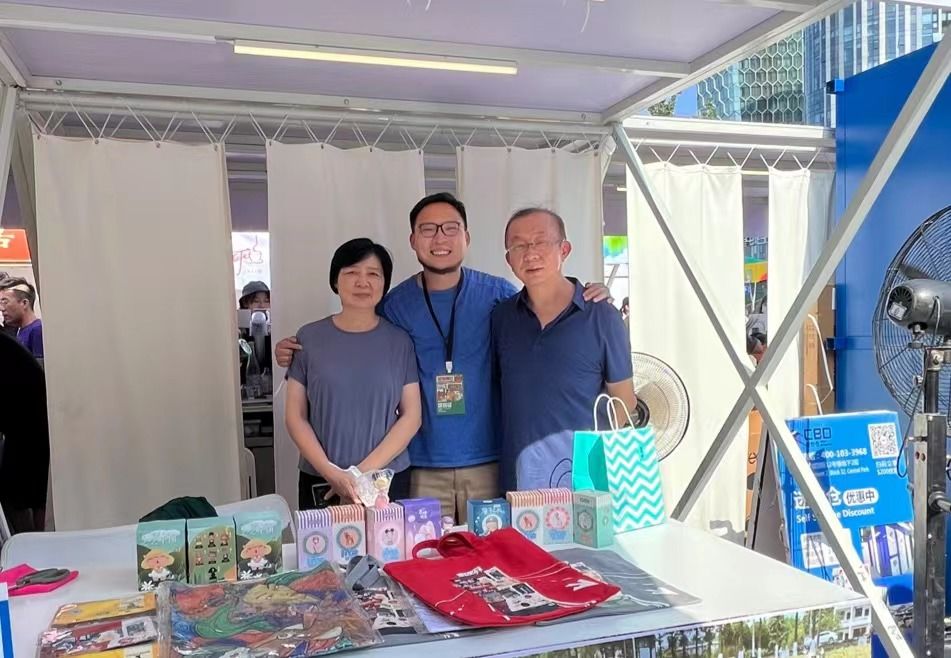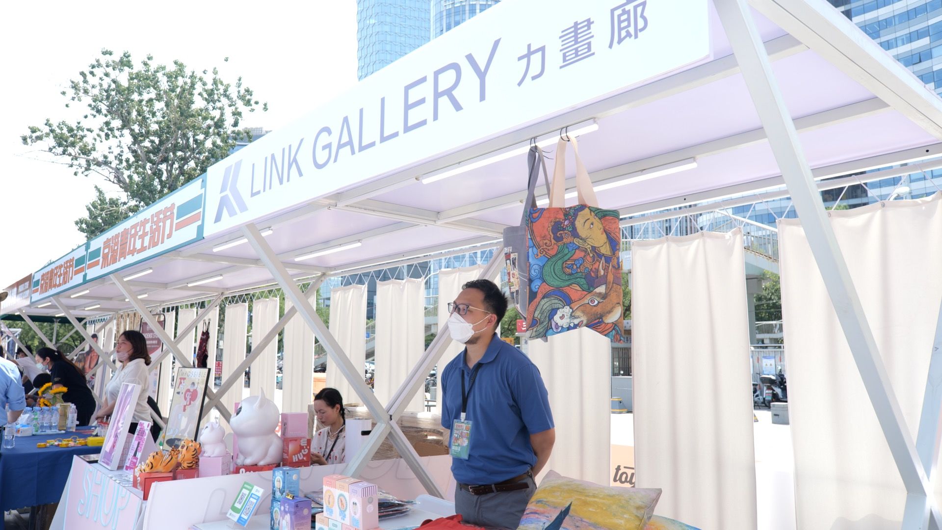 正值京港青年生活節(jié)開幕,近60個(gè)內(nèi)地和香港品牌在此擺攤,為京港藝術(shù)交流打call,囊括特色小吃、潮流文創(chuàng)……一位頗具藝術(shù)氣質(zhì)的攤主戴著細(xì)邊眼鏡,留著抹絡(luò)腮胡,跟前的攤位上擺放著文創(chuàng)娃娃、包包,造型別致。