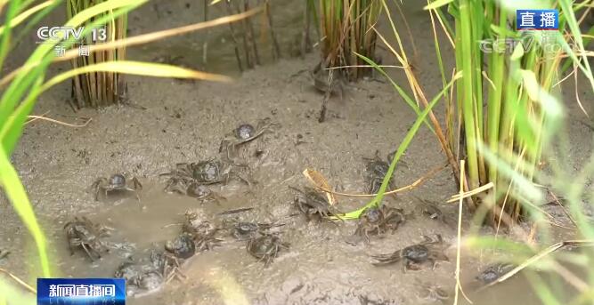 您看在這個小環(huán)境當(dāng)中,能看到小的扣蟹和大的河蟹,一年時間體積有非常明顯的變化。水稻可以為河蟹提供適宜的生長環(huán)境,隱蔽的空間可以幫助它們躲避敵害生物。同時,這些河蟹以水中的動植物為食,可以幫助清除田中的雜草和害蟲,這就是我們剛才提到的雜草逐年變少的原因。