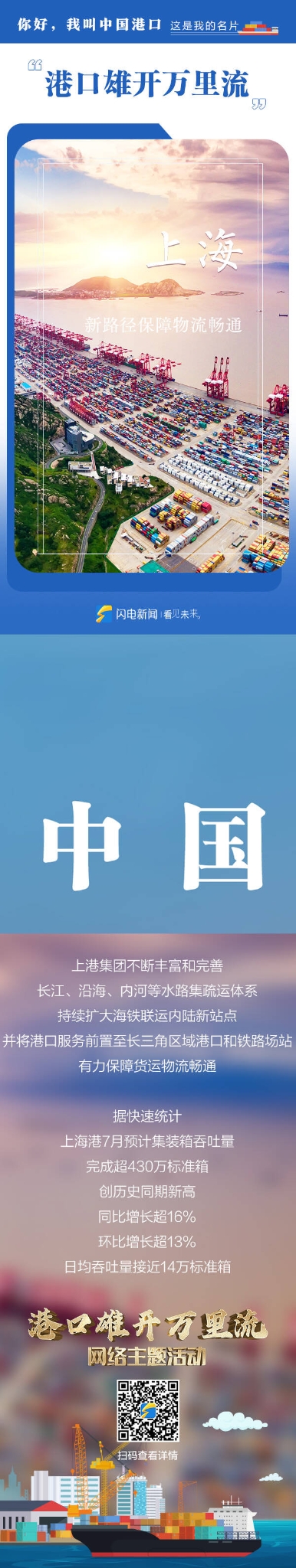 齊魯網(wǎng)·閃電新聞8月16日訊 面朝大海、背靠大陸,港口一直是開放與希望的象征,是反映對外貿(mào)易情況及國民經(jīng)濟(jì)發(fā)展的“晴雨表”。2022年前7個(gè)月,我國貨物貿(mào)易進(jìn)出口總值23.6萬億元人民幣,同比增長10.4%。其中,出口13.37萬億元,同比增長14.7%;進(jìn)口10.23萬億元,同比增長5.3%。閃電新聞用九張海報(bào),為您講述中國港口發(fā)展故事;用一組九宮格,帶您拼出中國港口“名片”!