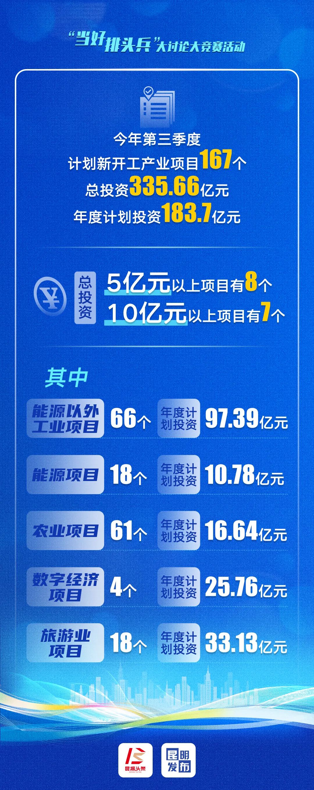 昆明市第三季度計(jì)劃新開工產(chǎn)業(yè)項(xiàng)目中,總投資5億元、10億元以上項(xiàng)目分別有8個(gè)、7個(gè);能源以外工業(yè)項(xiàng)目66個(gè),年度計(jì)劃投資97.39億元;能源項(xiàng)目18個(gè),年度計(jì)劃投資10.78億元;農(nóng)業(yè)項(xiàng)目61個(gè),年度計(jì)劃投資16.64億元;數(shù)字經(jīng)濟(jì)項(xiàng)目4個(gè),年度計(jì)劃投資25.76億元;旅游業(yè)項(xiàng)目18個(gè),年度計(jì)劃投資33.13億元。