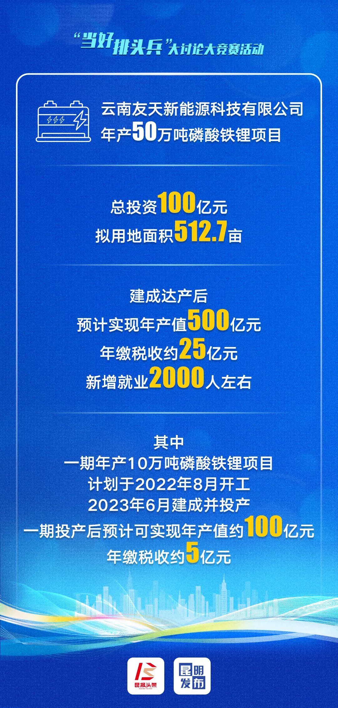 開工現(xiàn)場所在的云南友天新能源科技公司年產(chǎn)50萬噸磷酸鐵鋰項(xiàng)目,總投資100億元,項(xiàng)目分三期建設(shè),計(jì)劃2025年投產(chǎn),建成達(dá)產(chǎn)后預(yù)計(jì)年產(chǎn)值500億元,年繳稅收約25億元,新增就業(yè)2000人左右。目前,項(xiàng)目正在進(jìn)行基礎(chǔ)施工。