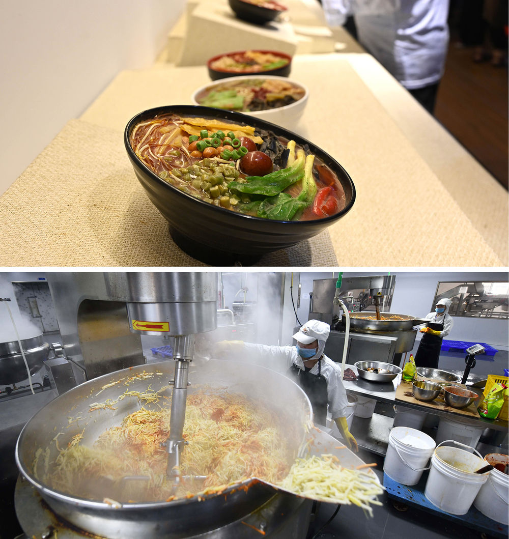 上圖:2021年4月29日拍攝的廣西柳州市螺螄粉飲食文化博物館展品。下圖:2020年1月2日,在廣西柳州市螺螄粉產(chǎn)業(yè)園一公司生產(chǎn)車間,工人在加工酸筍。