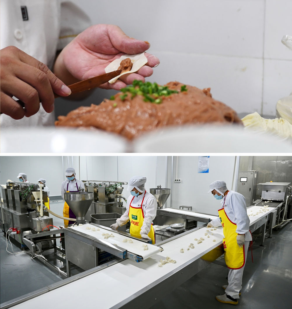上圖:2021年6月11日,在福建三明沙縣,沙縣廟門扁肉傳承人王盛濱在包制沙縣扁肉。下圖:2020年11月18日,在福建三明沙縣產(chǎn)業(yè)園,工人在生產(chǎn)餃子。