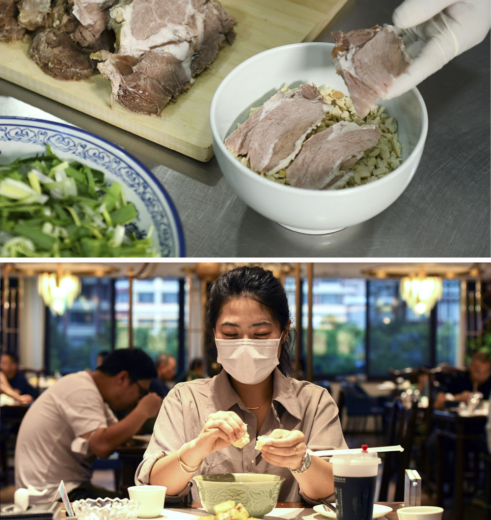 上圖:2021年1月2日,在西安老字號同盛祥飯莊,廚師制作羊肉泡饃。下圖:2022年7月27日,顧客在同盛祥飯莊掰饃。