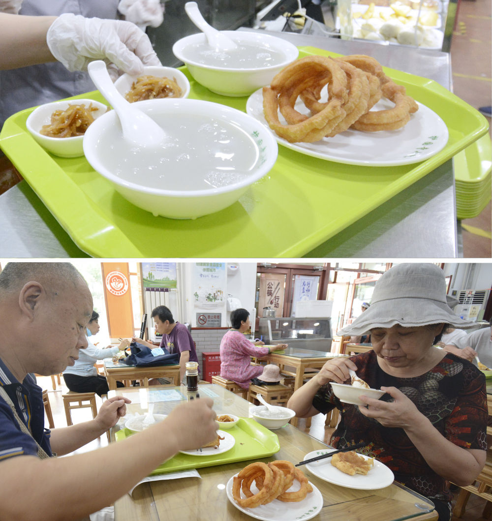 上圖:2022年7月13日在北京護(hù)國寺小吃紅蓮店拍攝的豆汁和焦圈。下圖:2022年7月13日,市民在護(hù)國寺小吃紅蓮店吃豆汁和焦圈等早點。