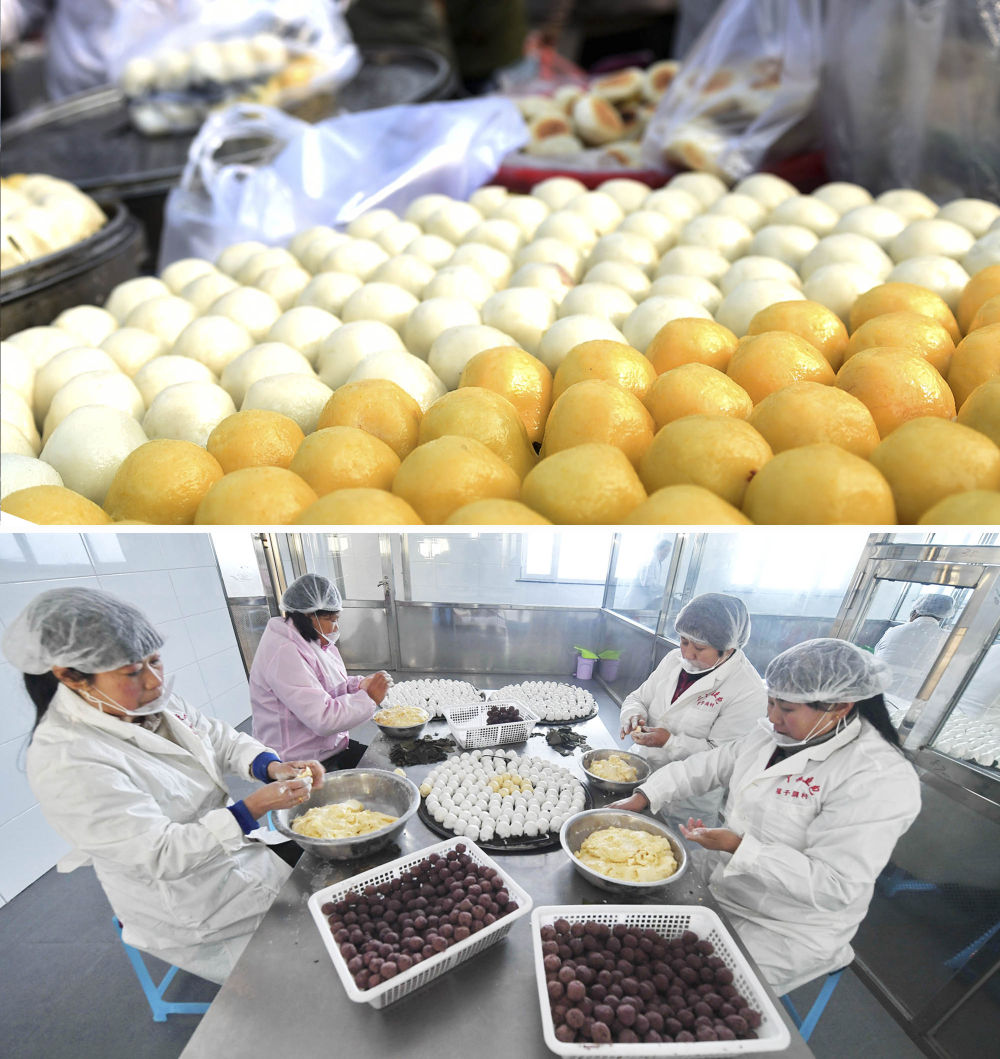 上圖:2015年2月15日,在遼寧沈陽蒲河鄉(xiāng)村集市上,黏豆包深受歡迎。下圖:2018年1月24日,在吉林市四平市一農(nóng)民專業(yè)合作社加工車間,工人制作黏豆包。