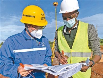 在烏干達(dá)卡魯瑪水電站施工現(xiàn)場(chǎng),中烏雙方工程師在討論施工圖紙。