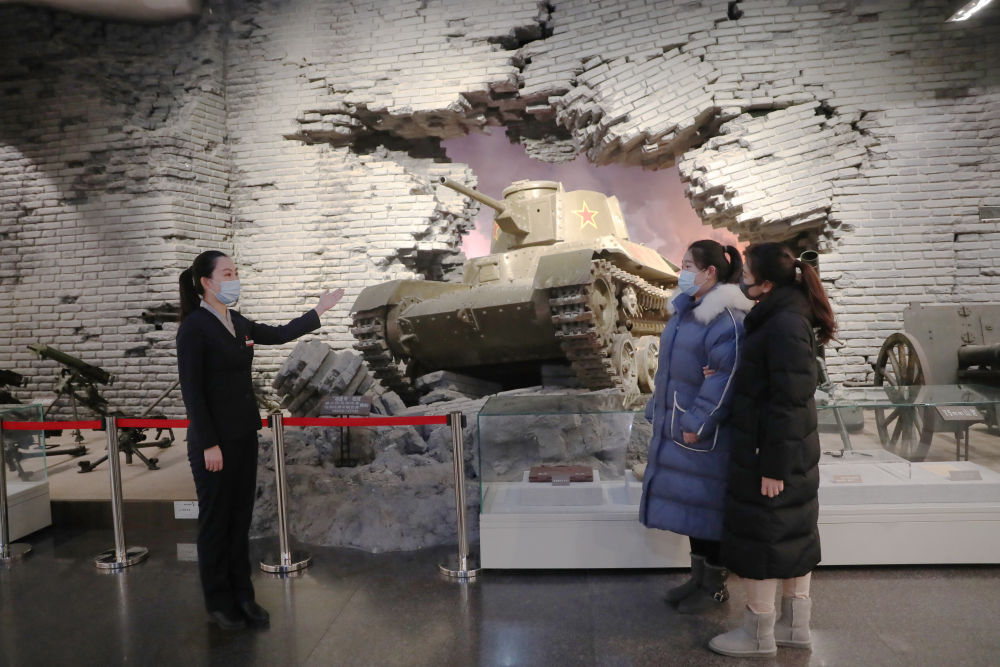 ↑遼沈戰(zhàn)役紀(jì)念館講解員為觀眾介紹人民解放軍攻城部隊(duì)攻破錦州城垣復(fù)原景象(2021年2月2日攝)。