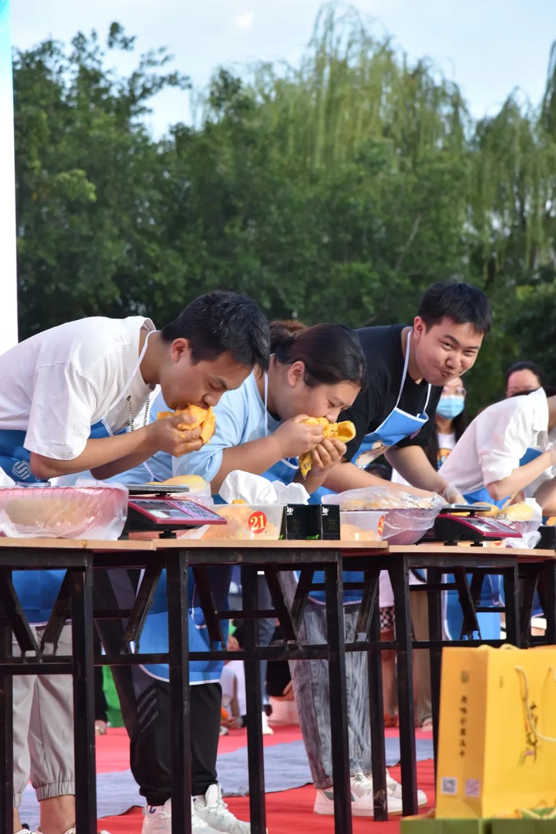 比賽要求參賽選手在2分鐘內(nèi)吃下盡量多的芒果,通過對選手“食量”稱重計算成績,最終評比出男、女子組獲獎選手。現(xiàn)場共有24名選手,分三組進行比賽。