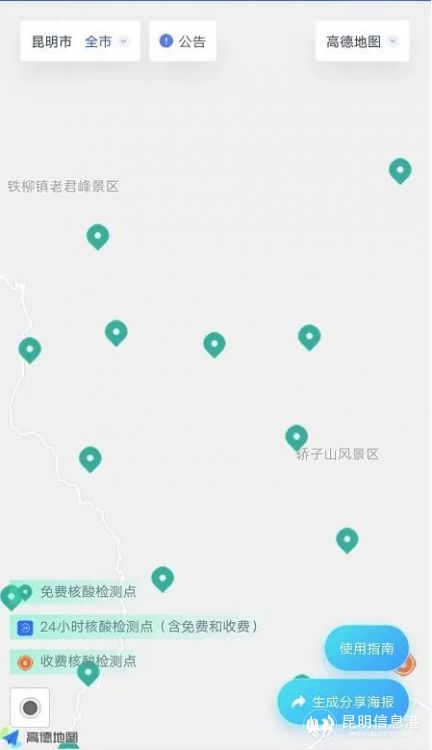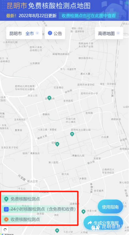 《昆明市免費(fèi)核酸檢測(cè)點(diǎn)地圖》有這些新變化:地圖除了依舊顯示全市免費(fèi)檢核檢測(cè)點(diǎn)外,即日起,同時(shí)顯示全市收費(fèi)核酸檢測(cè)點(diǎn)(含公立醫(yī)院和核酸醫(yī)療檢測(cè)機(jī)構(gòu)),以及24小時(shí)核酸檢測(cè)點(diǎn)(含免費(fèi)和收費(fèi))。地圖左下角有不同點(diǎn)位的圖標(biāo),讓群眾一目了然,便于依據(jù)需求找到自己想去的檢測(cè)點(diǎn)。