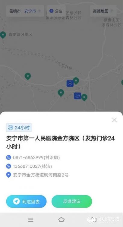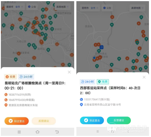 昆明信息港訊 記者楊雁 一圖在手,輕松找到你身邊的新冠病毒核酸檢測(cè)點(diǎn)!為進(jìn)一步方便在昆群眾,構(gòu)筑昆明防疫城池,從8月22日起,全市16個(gè)縣(市)區(qū)188個(gè)免費(fèi)檢測(cè)點(diǎn)、65個(gè)收費(fèi)檢測(cè)點(diǎn)(含公立醫(yī)院和核酸醫(yī)療檢測(cè)機(jī)構(gòu))、46個(gè)24小時(shí)核酸檢測(cè)點(diǎn)(含免費(fèi)和收費(fèi))在《昆明市免費(fèi)核酸檢測(cè)點(diǎn)地圖》中呈現(xiàn),實(shí)現(xiàn)一鍵導(dǎo)航、一鍵撥號(hào)查詢以及反饋建議的留言。(注:各縣區(qū)增設(shè)的臨時(shí)免費(fèi)點(diǎn)位不在地圖中展示,群眾可向社區(qū)咨詢)。