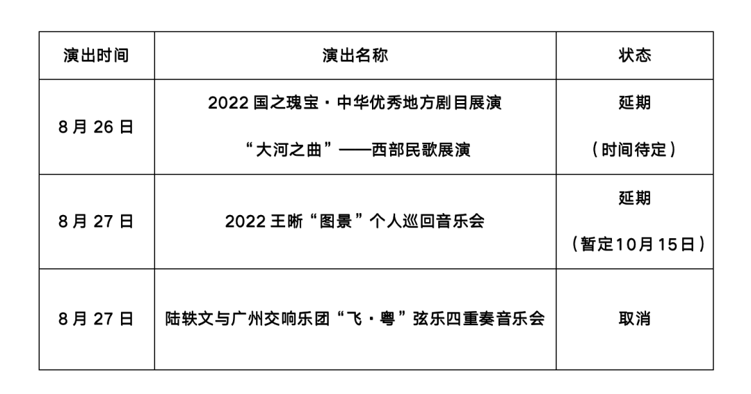 鑒于當下新冠疫情的特殊時期,為有效控制疫情和降低傳播風險,最大限度保證觀眾及演職人員的健康安全,配合疫情防控要求,我們遺憾地決定以下幾場演出延期及取消: