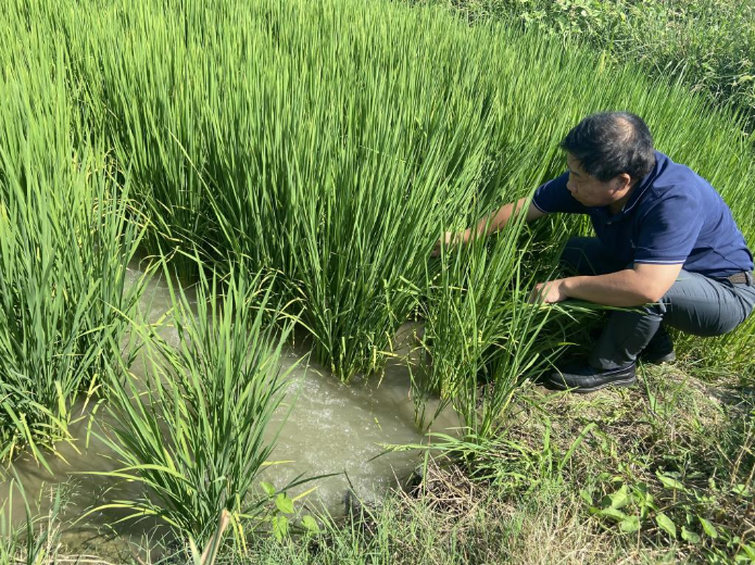 連日來,每天上午6點(diǎn)至11點(diǎn)、下午4點(diǎn)至7點(diǎn),陳富華都在田間地頭指導(dǎo)農(nóng)戶加強(qiáng)田間管理,防治病蟲害?!袄侠?,你的田還要接著灌水”“注意防高溫,用水來調(diào)溫,提高水稻結(jié)實(shí)率”……從上堰村到張湖村,從散戶到種糧大戶,陳富華一路耐心提醒,汗水早已把衣服浸透。