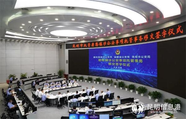 昆明信息港訊 記者合宇聰 8月26日,西雙版納州公安局、勐臘縣公安局、昆明市公安局在昆明市公安局指揮中心大樓舉行磨憨鎮(zhèn)涉公安事項托管事務移交簽字儀式。