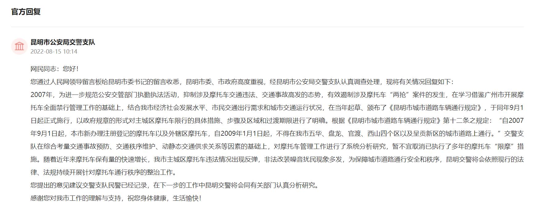 8月15日,昆明市公安局交警支隊(duì)針對留言進(jìn)行回復(fù):暫不宜取消已執(zhí)行了多年的摩托車“限摩”措施。具體內(nèi)容如下: