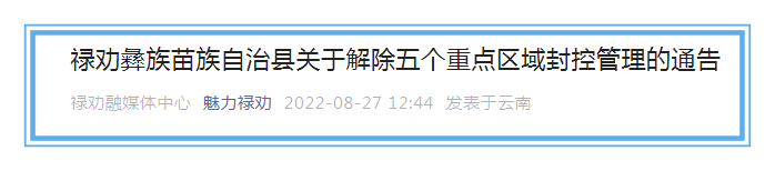 8月27日,祿勸應(yīng)對(duì)新冠肺炎疫情工作領(lǐng)導(dǎo)小組指揮部發(fā)布關(guān)于解除五個(gè)重點(diǎn)區(qū)域封控管理的通告。詳情如下: