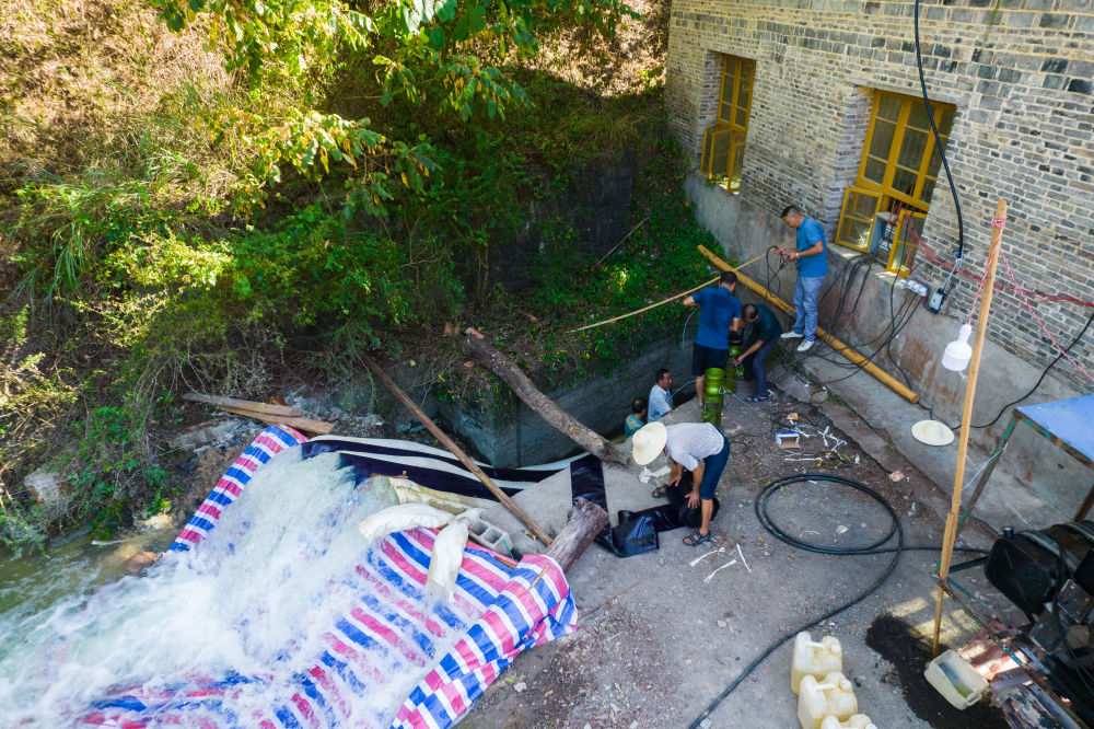 8月15日,在湖南省桃源縣熱市鎮(zhèn)郭家埡村,鄉(xiāng)鎮(zhèn)水利站工作人員在取水點安裝抽水設備(無人機照片)。新華社記者 陳思汗 攝