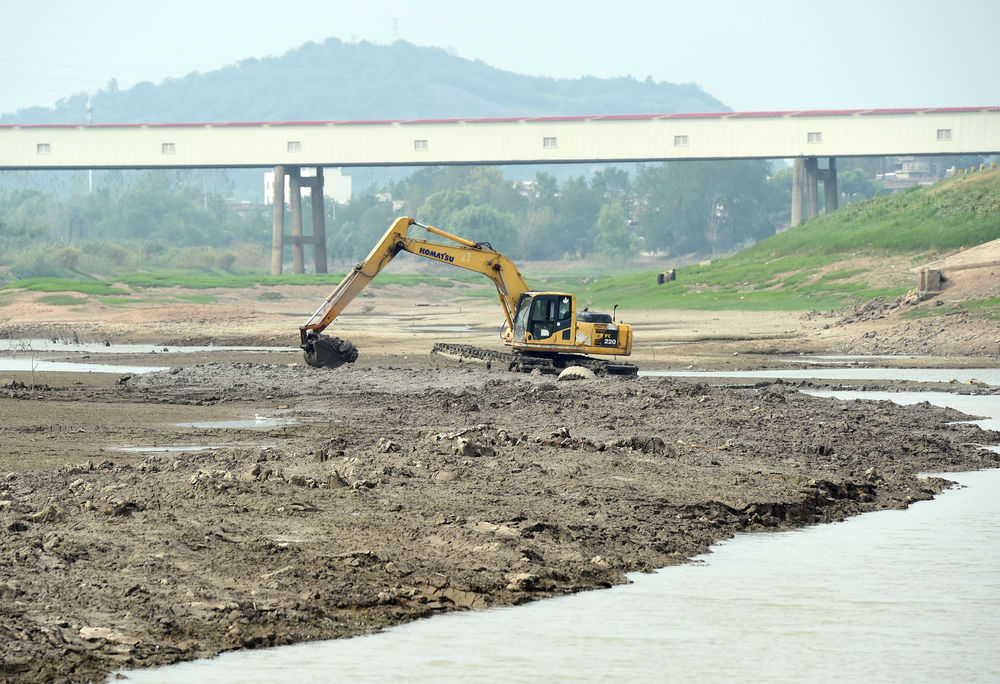 8月23日,在安徽省蕪湖市繁昌區(qū)荻港鎮(zhèn),水上挖掘機在河道里進行清淤作業(yè),疏通引水渠道。新華社記者 周牧 攝