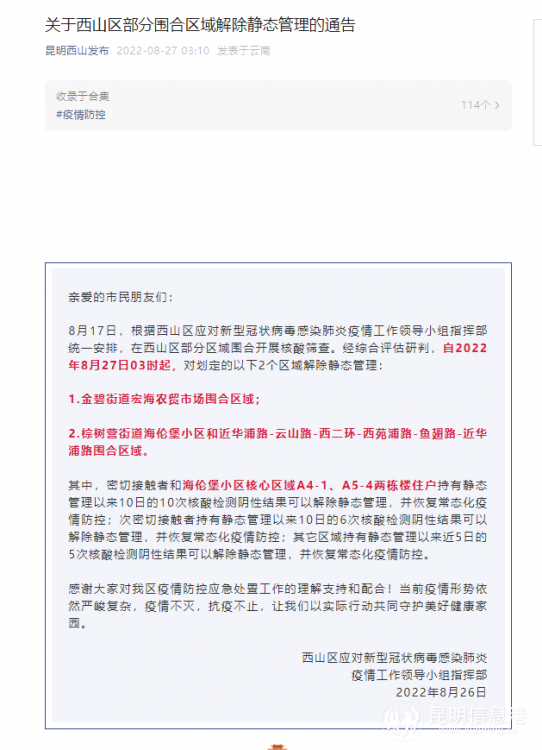 8月17日,根據(jù)西山區(qū)應(yīng)對新型冠狀病毒感染肺炎疫情工作領(lǐng)導(dǎo)小組指揮部統(tǒng)一安排,在西山區(qū)部分區(qū)域圍合開展核酸篩查。經(jīng)綜合評估研判,自2022年8月27日03時起,對劃定的以下2個區(qū)域解除靜態(tài)管理: