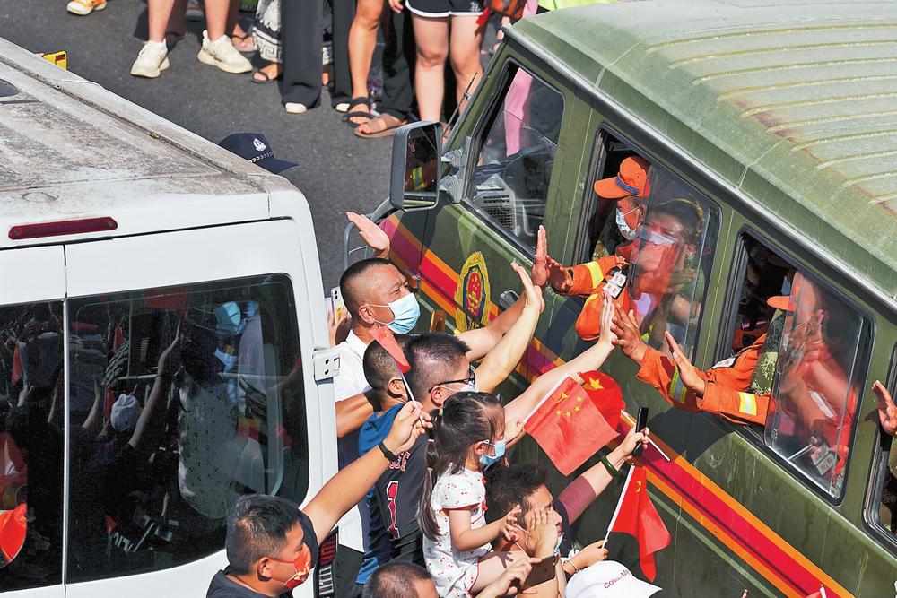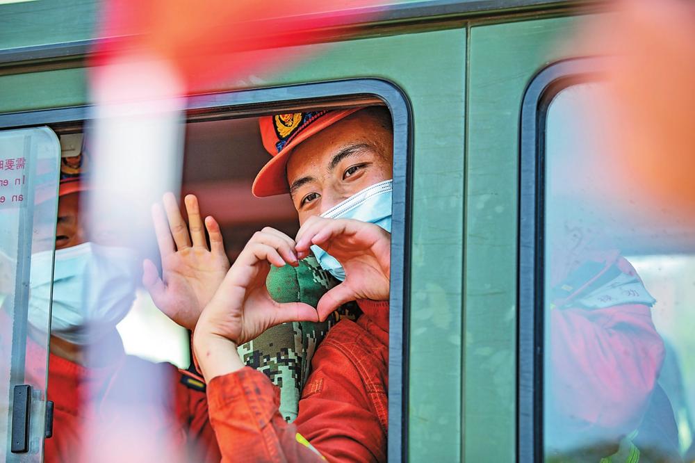 森林消防隊(duì)員向前來(lái)送別的群眾比心。新華社記者 黃偉 攝