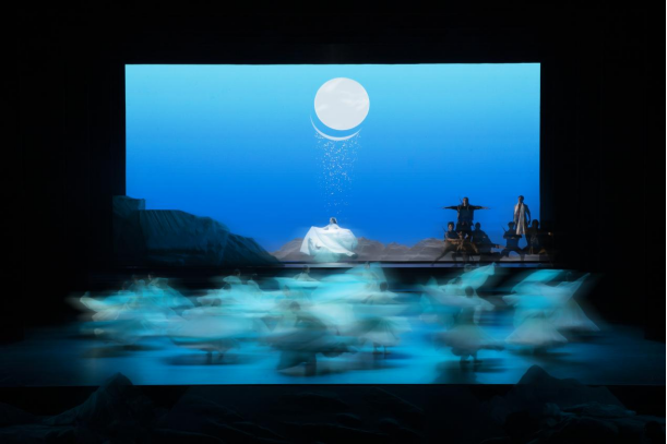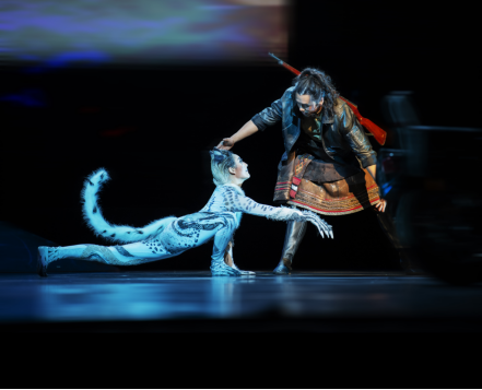 對幕后主創(chuàng)團(tuán)隊(duì)而言,《大河之源》旨在詮釋中華民族生態(tài)文明建設(shè)思想與環(huán)保理念,是一次用舞劇呈現(xiàn)時代主題的藝術(shù)化嘗試。在舞劇的編創(chuàng)上,《大河之源》通過擬人化的舞蹈語匯,將雪豹等野生動物的矯健靈敏形象展現(xiàn)在觀眾眼前,繪制了一幅萬物共生的生靈圖鑒,并通過大量磅礴震撼的群舞編排,呈現(xiàn)出長江、黃河、瀾滄江的奔涌浩蕩,刻畫出高原人民熱情好客的民俗風(fēng)情,更運(yùn)用擬態(tài)的“彩陶舞”向觀眾展現(xiàn)了三江源燦爛的歷史文化。不僅將高山之巔的壯闊之美展現(xiàn)在觀眾眼前,也借以“生態(tài)之美”喚起大眾對保護(hù)生態(tài)文明的關(guān)注與思考,以不同切面帶領(lǐng)觀眾見證“每一滴水”與“每一個生命”的重要生態(tài)價值。
