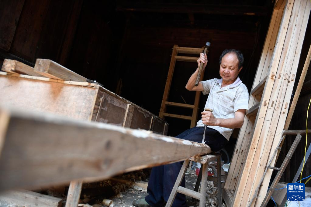 在浙江省松陽縣三都鄉(xiāng)楊家堂村,負(fù)責(zé)修復(fù)一古民居的工匠在制作木門(2018年5月25日攝)。新華社記者 黃宗治 攝