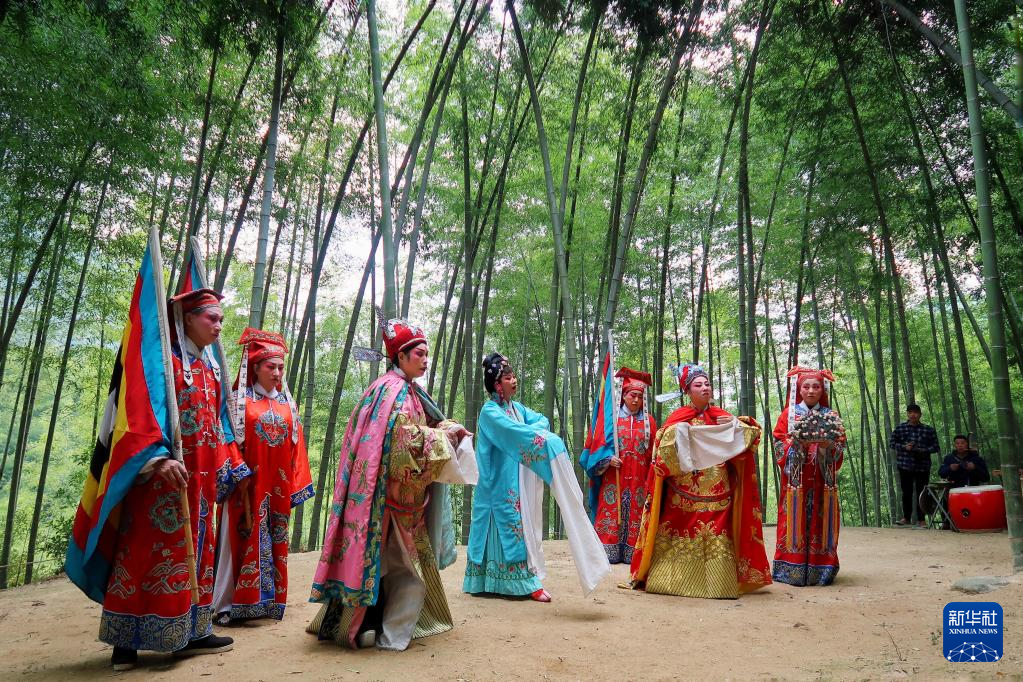 戲曲演員在浙江省松陽縣葉村鄉(xiāng)橫坑村“竹林劇場”表演松陽高腔(2019年11月12日攝)。新華社記者 鄭夢雨 攝
