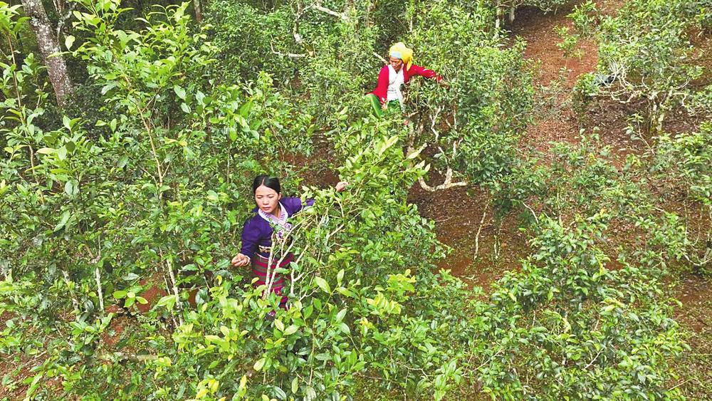 景邁山萬畝古茶園內(nèi),“90后”布朗族茶農(nóng)玉公砍和她的母親正在采茶。 陸煜 攝